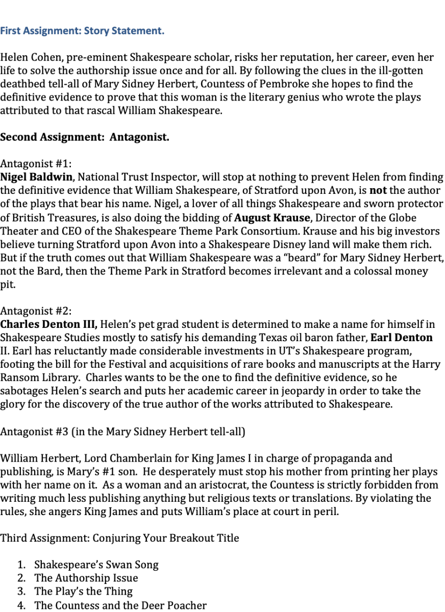 Nan Harrington McCann Posted December 10, 2021 Posted December 10, 2021 NY PITCH CONFERENCE pre-Assignments: Nan McCann.docx NY PITCH CONFERENCE Assignments Nan McCann/ A MAN OF TWISTED WORDS: A Peter Churchill mystery Assignment #1 Write your story statement. A Scotland Yard forensic linguist, reeling from dual heartbreaks of death and divorce, has less than 3 weeks to decode historical documents to save the United Kingdom from a Prime Minister who is a Russian agent. Then, he discovers his own family is involved. Does he choose family or country? Assignment #2 Sketch the antagonist. Keep in mind their goals, background, and ways they react to the world around them. The antagonist, GEORGES DELACROIX, is a double agent for the UK and Russia, with decades of experience in deception, forgery, and assassination. He has sworn allegiance to the Communist cause, and his motivations are personal, professional… and urgent. Dying of cancer, with only weeks to live, Delacroix has a fierce thirst for personal retribution, and a need to succeed, no matter the cost… all providing him with vital incentives to murder, financially ruin, blackmail or eliminate all from his past who threaten his resolve to achieve his goals. Georges Delacroix is crafty, dogged, and unforgiving, with the tools and the determination to triumph. Delacroix has created an elaborate linguistic maze, the Manifesto, a palimpsest (a document whose writing has been effaced, to make room for additional writing. Monks, in medieval times, did it to conserve parchment). This ploy was designed to place the opposing socialist candidate, a mole and a puppet for Russia, at the head of the British government, accomplishing a long-held Russian goal. On a personal level, in retaliation for a decades-old romantic snub by Peter Churchill’s mother, Delacroix targets her son, Peter, a renowned forensic linguist for Scotland Yard. Within days, he turns Peter’s cerebral life upside down with burglaries, threats, and physical attacks. Delacroix is a complex and worthy opponent for Peter Churchill, an antagonist who has the ability to bring about ruthless devastation as he targets not only individuals, but a nation. Assignment #3 Conjuring your breakout title. A MAN OF TWISTED WORDS THE SORBONNE CONSPIRACY THE WORDMONGER’S DECEPTION Assignment #4 Deciding your genre and approaching comparables. Who compares to you and why? My genre is Mystery. It is a high concept, forensic linguistic mystery set in present-day London. It resembles the Elizabeth George, ‘Lord-of-the-Manor-as-Sleuth’ type of genre. A Lord Peter Wimsey meets George Smiley read or, rather, a 21st century Downton Abbey mystery… only with forensic linguistic puzzles, Russian skullduggery, and a Gordian knot of complicated relationships, all threatening the survival of British democracy. Forensic linguistics, the intersection between language, crime, and the law, deals with forged wills, ransom notes, plagiarism, verification of authorship, threats, etc.… word puzzles, of a sort. This mystery centers around a student Manifesto and Peter’s ability to discover who is its author, and therefore, a murderer, and agent for Russia. Susan Elia MacNeal, and Kate Quinn and Cara Black are similar current reads. These combine history, intrigue, and international protagonists who are navigating the challenges of being placed in the bull’s eye of unfamiliar, life-threatening situations, while having to rely on intellect and determination to solve the crimes. However, with a ticking clock, forcing the decoding of intricately plotted puzzles, and with international espionage at the crux, one might be reminded of Dan Brown and John LeCarré with their similar types of enigmas, betrayals, and adversaries. Assignment #5 Write your own hook line (logline with conflict and core wound following the format above). A Scotland Yard forensic linguist, reeling from the recent deaths of his father and older brother, and a difficult divorce, has less than three weeks to decode historical documents to save the United Kingdom from a Prime Minister who is a Russian agent and murderer. Then he discovers his own unconventional family is involved in the past crimes and are now in grave danger. Does he choose family or country? Assignment #6 Other matters of conflict: Two more levels. Sketch out the conditions for the inner conflict your protagonist will have. Why will they feel in turmoil? Conflicted? Anxious? Sketch out the hypothetical scenario in the story wherein this will be the case—consider the trigger and the reaction. Next, sketch a likewise hypothetical scenario for the “secondary conflict” involving the social conflict. Will this involve family? Friends? Associates? What is the nature of it? Peter Churchill’s inner conflict: Dr. Peter Churchill is an ivory tower academic who delves into lexical riddles for Scotland Yard and MI5. It’s a safe, cerebral job that keeps him out of danger. Or so he thinks. When an ailing French professor, GEORGES DELACROIX, hands Peter a packet containing coded, historical documents, he throws Peter into unaccustomed emotional and physical turmoil. According to the odd visitor, the author of this student Manifesto is a double agent and the murderer of Peter’s uncle, whose assassination, he claims, is the catalyst for upcoming political mayhem. Delacroix demands that Peter authenticate the documents to prevent a Soviet agent from becoming prime minister. Or, rather, thwart a murderer from continuing his elimination of all who had known him in the past. Peter’s inner conflict centers on his fear that, in many ways, he is the wrong man for the job. He’s coping with the recent deaths of his father and older brother and his own PTSD from being the sole survivor of that car accident. Although he’s a forensic linguist, he agonizes about the consequences of his inability to solve the linguistic puzzle within three weeks. Such an outcome, which rests sole