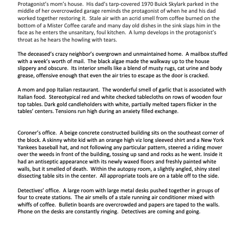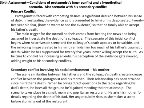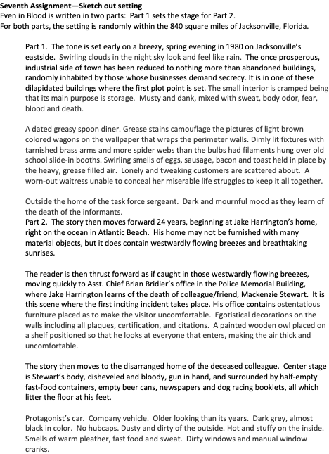 7 Conference Assignments Story Statement: Detective Jacob Harrington must prove his colleague’s death is anything but suicide so he can discredit his father’s death, resolving his own personal issues, allowing him to begin healing. Antagonist: Rookie police officer Alan Pendergrass, fresh out of recruit school seeks revenge, as he develops a well-crafted scheme to work his way around the department, getting close enough to track down and eliminate the remaining narcotic task force members who used his father as an informant, ultimately causing his death. Everything seems to quickly fall into place for him, a bit too easily perhaps, as he becomes arrogant, pushes the limits and gets careless. His actions leave us with the sentiment, one who desires revenge digs two graves. Breakout Title: Suicide by Deceit Genre/Comparable Fiction: Crime Fiction (Detective novel) Suicide by Deceit has both a similar premise and theme as Dead Irish, by John Lescroart. Suicide by Deceit’s, Jacob Harrington, like Dead Irish’s Dismas Hardy, finds his drive to investigate the death of a colleague in order to relieve the agony he feels from the belief that his father had committed suicide, and in Hardy’s case, his close friend. After several twists and turns in both novels, the investigation rests with a killer who sought revenge for loss of the potential life that was taken from him so many years before. Suicide by Deceit has similar prose as compared to In Cold Blood by Jack Hunt. Both follow a similar, natural flow of ordinary speech. The dialogue is direct and uses language you would hear people use in casual, everyday conversation. With further research, I found that Jack Hunt has published many books, however, he is new to the mystery genre as In Cold Blood is his first. Hook Line (Log line): A detective who suffers with abandonment issues after finding his father dead of an apparent suicide, fights to prove the death of a colleague is anything but suicide in order to refute his father’s death and regain his feeling of self-worth. Other Matters of Conflict: Harrington and his mother stay in constant conflict, as she has been unable to deal with her husband’s, Harrington’s dad’s, death. When she’s not ignoring Harrington, she’s directing her anger towards him. As far as their relationship is concerned, it’s almost as if he found both parents dead on that fateful day. Harrington’s relationship with his immediate boss, Asst Chief Brian Bridier. Once Bridier makes up his mind, there’s no changing it. They each have their own ideas as to which direction the investigation should take. Bridier’s asshole, power hungry personality clashes with Harrington as he pushes through the investigation. Harrington’s relationship with his girlfriend, Grace is strained. His abandonment issues do not allow him to trust. He feels vulnerable, and his head won’t allow his heart to fully commit. Setting: The setting is randomly within the 840 square miles of Jacksonville, Florida. The tone is set early on a breezy night in 1980 on Jacksonville’s eastside. The once prosperous, industrial side of town has been reduced to nothing more than abandoned buildings, randomly inhabited by those whose businesses demand secrecy. It is in one of these dilapidated buildings where the first plot point is set. The story then moves forward 24 years, beginning at Jake Harrington’s home, right on the ocean in Atlantic Beach. His home may not be furnished with many material objects, but it does contain westwardly flowing breezes and breathtaking sunrises. The reader is then thrust forward as if caught in those westwardly flowing breezes, moving quickly to Asst. Chief Brian Bridier’s office in the Police Memorial Building, where Jake Harrington learns of the death of colleague/friend, Mackenzie Stewart. It is this scene where the first inciting incident takes place. The story then moves to the disarranged home of the deceased colleague. Center stage is Stewart’s body, disheveled and bloody, gun in hand, and surrounded by half-empty fast-food containers, empty beer cans, newspapers and dog racing booklets, all which litter the floor at his feet. Something about the crime scene, about Stewart in particular, doesn't sit well with Harrington, but he can't quite put his finger on it. Throughout the remainder of the story, the setting’s locations split time at his mother’s neglected home, at Stewart’s crazy neighbor’s overgrown and unmaintained home, at the pseudo sterile office of the coroner, at various offices located in the Police Memorial Building, at various eating establishments from Arlington to the westside, and concludes at the police chief’s home in Nocatee.