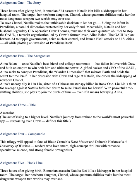1. ASCENSION...My first four pages: Chapter One The Rising Storm February 18, 2025, Durham, North Carolina Natalia lies in a hospital bed at Duke University, holding her newborn daughter against her chest. The white sheets crinkle as she shifts beneath them, pain radiating from her C-section incision. Chanel is barely three hours old, but her dark eyes seem focused, watching with an awareness that defies explanation. A familiar wisp disturbs the sterile air—a presence she knows intimately. Her past self, astral projecting from 2019, was witnessing this moment. The temporal loop closes as Natalia tells her younger self to return to her own time before she runs out of energy. She feels the presence fade, leaving only the antiseptic smell of the hospital and the weight of her daughter in her arms. Where the hell is Crew? Her husband should be here. They planned this moment for years, but when her labor accelerated, two weeks early, he was already en route to Moscow for "urgent intelligence." His absence burns like acid. Chanel makes a soft sound, not quite crying. For just a moment, Natalia swears the infant winks at her—not possible for a newborn, but the flutter is unmistakable. "You're special, aren't you?" she whispers to her daughter. "You have both our gifts flowing through you." Natalia can already sense it—the quantum resonance humming beneath Chanel's alert gaze. Both she and Crew mastered reality manipulation through years of training and natural ability. Their daughter was conceived by two people who can bend space-time itself. What kind of genetics could emerge from that combination? Her phone buzzes. A text from Crew: Sorry. Moscow essential. Back soon. Love you both. "Essential," anger flaring hot in her chest. She carried his child for eight and a half months, labored for eighteen hours, and he's in Russia playing spy games with his ex. Sounds in the hall interrupt her brooding. Something is not right. Through her open door, she sees an Eastern European-looking man entering the maternity ward. Unremarkable face, careful movements, watching. He doesn't belong here. The CIA cordoned off this entire floor, yet he made his way through security like smoke. Natalia's body transforms instantly from exhausted mother to lethal predator. Every sense sharpens as she recognizes the threat. He has a Romanian accent when he speaks to the nurse. Professional insertion. Targeted extraction. He's here for Chanel. She hits the call button while shifting Chanel to her left arm, keeping her right arm free. Through the narrow window, she sees him approaching the nurse's station. The duty nurse looks up with a smile that dies as his blade opens her throat. No hesitation. No emotion. Professional work. Natalia's mind races through options as she watches him check the medical chart outside her door. Chanel Thomas. He knows exactly who he's hunting. The Romanian terrorist enters her room with confidence, carrying a cotton bag for extraction. He dismissed her as incapacitated—a woman who gave birth hours ago, alone and vulnerable. His first mistake is underestimating a master assassin. His second mistake is threatening a child whose quantum signature already blazes brighter than most trained operatives. Natalia moves the instant he reaches for Chanel. Pain explodes through her incision, but adrenaline overrides. She rolls from the bed, placing herself between the evil man and her child and grips the scalpel she palmed from the medical tray. "Step back," she warns in Romanian. He smiles, recognizing a fellow professional. "Natalia Net. Your reputation precedes you." "Then you know this ends badly for you." "Perhaps. But the child comes with me regardless. Do you have any idea what she's worth? Two masters of quantum physics for parents?" His eyes gleam with avarice. "The GAUL will pay any price for that kind of potential." "She's three hours old." "Old enough for her abilities to manifest. I can feel the strength radiating from her even now." He lunges forward. "She'll be the most powerful operative ever trained." Natalia anticipates his approach. She sidesteps, using his momentum against him while driving the scalpel toward his carotid artery. He deflects the strike, countering with an elbow toward her wounded abdomen. Natalia twists away, the blow glancing off her ribs instead of reopening her incision. She maintains her grip on Chanel throughout the exchange, protecting her daughter even while fighting for their lives. The kidnapper presses his advantage, forcing Natalia backward toward the window. Blood seeps through her hospital gown as stitches strain under the physical stress. She's operating on willpower and maternal fury, her body pushed far beyond safe limits. "You cannot win," he says, circling like a predator. "You are weak. Wounded. I am fresh and prepared." "You talk too much." Natalia feints left, then spins right, using the Romanian's confidence against him. As he commits to blocking her attack, she drops low and sweeps his legs. He stumbles, off-balance for just a moment. That moment is enough. Natalia drives the scalpel upward, finding the gap between his ribs. The blade pierces his heart, stopping it instantly. He drops without a sound, his body going limp as life exits. She staggers against the wall, exhaustion and blood loss threatening to overwhelm her. Chanel remains perfectly calm throughout the violence, watching. "It's okay, baby," Natalia whispers, checking her daughter for any harm. "Mama's got you." Her phone buzzes. Another text from Crew: Meetings running long. I'll be there tonight. Rage fills the space where adrenaline burned. Crew is networking with Nora and the Russians while Natalia kills an assassin to protect their gifted child. The betrayal feels more devastating than the physical pain. CIA operatives flood the hallway minutes later, their shouts echoing. They find two dead agents in the corridor and the Romanian's body cooling in her room. Professional cl