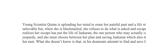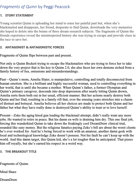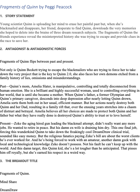 Peggi Peacock Posted October 13, 2021 Posted October 13, 2021 Fragments of Quinn by Peggi Peacock 1. STORY STATEMENT Young scientist Quinn is uploading her mind to erase her painful past and a life where she is unlovable but, when she is blackmailed, she refuses to do what is asked and escapes. Quinn realizes her escape has put the life of Jaskaran, the one person who may actually care, in jeopardy and she must choose between her plan and saving Jaskaran, which also means facing her past. What she doesn't know is that, in his desperate attempt to find and save Quinn, Jaskaran has unknowingly revealed fragments of her past by downloading Quinn's uploaded data into the minds of three dream research subjects. The fragments of Quinn the friends experience reveal the misinterpreted history she was trying to escape and provide clues in the race to save her. 2. ANTAGONIST & ANTAGONISTIC FORCES Fragments of Quinn flips between past and present. Not only is Quinn Beckett trying to escape the blackmailers who are trying to force her to take down the very project that is the key to Quinn 2.0, she also faces her own demons etched from a family history of lies, omissions and misunderstandings. Past—Quinn’s mom, Amelia Slater, is manipulative, controlling and totally disconnected from human emotion. She is a brilliant and highly successful woman, used to controlling everything in her world, that is until she became a mother. When Quinn’s father, a former Olympian and Quinn’s primary caregiver, descends into deep depression after nearly letting Quinn drown, Amelia sorts them both out in her usual, efficient manner. But her actions nearly destroy both Quinn and her Dad, resulting in a family rift that, over the ensuing years stretches into a chasm of distrust and betrayal. Amelia believes all her choices are made to protect both Quinn and her father but what they have really done is destroyed Quinn’s ability to trust or to love herself. Present—Zeke the aging hired gun leading the blackmail attempt, didn’t really want any more jobs. He wanted to retire in peace. But his damn ex-wife is draining him dry. This one final job, forcing this wunderkind Quinn to take down the freakingly cool DreamDraw clinical trial, sounded like easy money. But the religious fanatics paying Zeke’s bill are about the worst clients he’s ever worked for. And he’s being forced to work with an amateur, another damn geek with local and technological knowledge Zeke doesn’t possess. Not his fault he can’t keep up with the world. And this damn target, this Quinn kid, she’s a lot tougher than he anticipated. That pisses him off royally, but she’s earned his respect in a weird way. 3. THE BREAKOUT TITLE Fragments of Quinn. Mind Share DreamDraw 4. COMPARABLES Near Future Kate Morton X Black Mirror Fragments of Quinn is: • a near future Kate Morton tale, full of family secrets and lies; • like the series Black Mirror, ratcheting up ordinary human experience with plausible near-future tech; • like Paula Hawkins’ Into The Water, revealing secrets and lies through first and close third POV; • like Ishiguro’s Never Let Me Go, built on a Sci-Fi backstory simply to provide the mechanism necessary to make the story work. 5. HOOK OR LOGLINE Young scientist Quinn is uploading her mind to delete her painful past but, when she’s blackmailed, she refuses to take down the very tech enabling her plan. Quinn escapes her blackmailers and disappears. Her friend, Jaskaran, desperate to find Quinn, downloads the very memories she hoped to delete into the only system possibly able to interpret the data: other human brains. Three friends participate in DreamDraw, the clinical trial for the cool new tech that turns dreams into images. After DreamDraw, things change. Dixon, the commitment-phobic player, pukes his brains out every time he attempts a new conquest. Beth’s carefully constructed grief vault quakes, about to blow. Ali, the painter of muted watercolours, presses intense oil images onto massive canvases with her fingers. When Beth and Dixon attend Ali’s art show and see the images from their heads on graphic display, it becomes clear that DreamDraw is at fault. They confront Jaskaran and the braided narratives collide. Realizing their experiences originate in the mind of Jask’s missing colleague, a sad young woman they now feel connected to, the friends decide to help Jask find Quinn and save her from the blackmailers and herself. The fragments of Quinn the friends experience reveal the misinterpreted history she was trying to escape and vital clues in the race to save her from the blackmailers and the potential fatal impact of her accelerated mind upload. 6. INNER & SECONDARY CONFLICT Inner Conflict – Unworthy of Love or Life but Desperately Wants Both Quinn’s misconstrued view of her past has led her to believe she is unworthy of love, perhaps unworthy of even living. In turn, this view has led her to the plan to upload and edit out her past, a plan that could really be viewed as a veiled suicide attempt. Quinn’s plan creates direct conflict with her true desire to be loved. She rationalizes that her mother will be so proud of the academic accomplishment – being the first human SIM – that she will finally love Quinn. Quinn’s father, the former Olympian, spent the first five years of Quinn’s life, before he abandoned her, training Quinn to be the strongest girl in the world. Quinn rationalizes that creating a better, stronger, more lovable version of herself will make her Dad proud, perhaps enough to return to Quinn’s life. Quinn refuses to admit to herself that her plan to wipe out her history will eliminate the possibility of earning that love as she won’t even know who her parents are. This conflict is evident throughout the story. For example, why does Quinn not just let blackmailers kill her if she is truly unworthy of living? Because she must be strong and justifies her desire to 