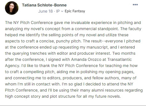 EditorAdmin Posted March 9, 2021 Posted March 9, 2021 Reviews of The New York Write to Pitch Conference THE FOLLOWING COLLECTION OF CONTRACT NEWS AND GENERAL COMMENTARY COVERS THE PAST SEVERAL YEARS. THESE ARE AN ESTIMATED 20% OF THE TOTAL MAILS, INTERNET POSTINGS, AND OTHER COMMUNICATIONS FORWARDED TO US. __________________ A quick note to say thank you because I attended the Write to Pitch conference in December (I was in Paula's group) and just landed a contract with The Book Group agency for MAYBE WE MEANT IT which I completely credit to the conference. I spent the winter editing my book based on what I learned that weekend, as well as in the eBook. My agent just landed a six-figure deal with Park Row Books, and I am pinching myself. - Bri LeClerc Just wanted to share the happy news that I've landed an agent from CAA for ACTS OF CONTRITION... The refinements to the ms and pitch we worked on in June were a huge help. Thank you! - Luke Cohler My big takeaway from the conference was that I had something... I began to revise the manuscript based on the notes I'd received. The Write to Pitch was intense, and difficult, but worthwhile. It also gave me the tools necessary for the all important query. I queried Mark Gottlieb at Trident Media. He read the novel, offered representation, and soon after, he sold the book. - Lynn Tavernier After the New York Write to Pitch, I realized I needed more help to prepare my manuscript before querying, so I reached out to Michael Neff for developmental editing. Not only did he enlist multiple published authors in my genre to assist with providing critical insights that took my novel, MIA'S LIST OF DON'TS, to the next level, he became my biggest advocate in the publishing world. He sent my finished MS to agents he knows and ended up being my matchmaker with the popular literary agent Terrie Wolfe. - Laura McCamy I attended New York Write to Pitch in June 2024 and five weeks later received an offer of representation from an agent for my thriller novel THE BETTER MOTHER using the novel and pitch their faculty helped me perfect. I am confident it never would have happened so fast (or at all) if I hadn't taken their valuable development and marketing advice to heart. I am now signed with Crooked Lane. - Jennifer Van Der Kleut Renee Richards was signed by the Talbot Fortune Agency who will rep her upmarket novel entitled LEAVING WOODSTOCK. In her own words regarding the WTP conference: "I was fortunate to be assigned to the incredible Paula Munier during the conference, and her guidance was instrumental in securing my current full manuscript request." From debut-author CJ Rivera, comes a harrowing tale of a parent risking it all for her child. THE FINAL ORCHARD is perfect for those looking for a novel that intrigues like television shows such as Black Mirror. Here we have a new novel fresh off the Write to Pitch event in New York and straight into the hands of Angry Robot in the U.K. Thanks also to Michael and the event faculty who worked behind the scenes with Crystal. We wish her huge success! A Life-Changing Experience - Leading to a Book Deal. If I could capture my experience at the New York Write to Pitch Conference in a single word, it would be "transformative." It's a unique blend of a supportive writing community and insightful mentorship that sparked a revolution in my writing approach. The preparatory reading assignments alone were worth their weight in gold. They stretched my understanding of narrative structure and character development, reshaping my own work. I can't emphasize enough the value they added to my writing journey. - Crystal Rivera ______________________ Susan Breen's MERRY pitched as THE MAN WHO INVENTED CHRISTMAS meets IT'S A WONDERFUL LIFE, was sold to Jess Verdi at Alcove Press at auction. Represented by agent Paula Munier publication in fall 2025. Agent Katharine Sands of the Sarah Jane Freymann agency has signed a T.E. Bean, a brilliant new writer and his SFF novel, NIGHT EYES. Congrats to all involved and special thanks to Michael Neff, his workshop leader! Moveable Type Managment has signed several NYWP and Algonkian authors since 2022 for commercial publication. Among them are Gregory Carpini Jr. and his historical novel SHINEY POWDERED FACES; Jennifer Ericson and her cozy mystery series CURIOSITY RESCUED THE DATE; Jody Gerbig's postpartum horror novel TAKE CARE; and Gerri Lewis' obituary writer mystery THE LAST WORD sold to Tara Gavin at Crooked Lane. Most recently MTM signed MARKERS UNKNOWN, a tech-thriller by writer O.E. Soderberg. In her own words: "It is a total dream come true, and I can’t thank you enough for everything. Your conference is truly one of a kind and has turned me into the writer I want to be." Audrey Woods sold her short story, Miss Suspicious, to Brendan Deneen at Blackstone, whereupon the film rights were sold to Universal Studios. Hollywood is beginning to notice the Write to Pitch Conference, and we're going to keep it that way. Carola Lovering's best selling novel, TELL ME LIES, has been turned into a successful TV show on Hulu, now going into its second season. The Write to Pitch Conference made it all possible back in 2018. Great to hear from you, Carola! I signed with my dream agent in late June of this year. My experience at the New York Write to Pitch conference in March '23 was a worthwhile investment that gave me the extra push I needed to fine-tune my manuscript with a deeper insight and clearer vision for my story. The pre-event assignments were key in guiding my revisions before and after the workshop, and the personal attention Susan provided in the classroom was invaluable. - Wendy Tatum The Corviserio Literary Agency just signed Melissa Mohalla's SFF, SYMPHONY OF CHAINS, for representation after meeting at the Algonkian NYWP. Congrats to all those who made a new six-figures-in-auction possible! Fingers X'd for a great novel. The Cindy Bullard Agency as recently signed three new clients 