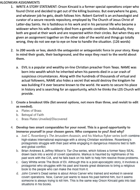 Nicki Nance Posted December 24, 2024 Posted December 24, 2024 Seven Assignments NIcki Nance.docxNicki Nance: Pre-event Assignments STORY STATEMENT Magically gifted foster child Jack Morelli grows up searching for his brother, Michael, who was taken by demons that dwell in a labyrinth of tunnels under New Orleans. He keeps his dark secrets until he falls in love with psychic Emmie Borell, who has the magical resources to help in his quest. Bringing the truth to light casts a shadow on everything he believes about his purpose, magic, and himself. ANTAGONIST Ma’gador is the damaged son of the demon king, K’hal, and the witch Malinda. He was five years old when K’hal became enthralled with Sheila, a younger, more powerful witch, pregnant with his child. Malinda left Ma’gador with K’hal, fearing he was too unruly for the human realm. Ma’gador hated K’hal for driving her away, Malinda for deserting him, and himself for being unlovable. Sheila, a drug addict, left K’hal the day their son, Ka’pel, was born. Ma’gador resented K’hal for grieving Sheila and tormented Ka’pel mercilessly despite harsh punishment. On Ma’gador’s twentieth birthday, he learned from K’hal that although hybrids could not take souls, they could procure magic to power up their soul-snatching. K’hal assigned Ma’gador to learn how to extract and transfer magic by observing a witch, Coletta, transfer magic to her son and then steal magic from Coletta and her son. Ma’gador adored Coletta, and she cared for him. He chose her well-being over K’hal’s approval. Forbidden from being with her, Ma’gador secretly protects Coletta from the demons who still want her magic. BREAKOUT TITLE LIST 1. Tunnel Demons of New Orleans, Book 1: Under the Crescent Moon 2. Tunnel Demons of New Orleans, Book 1: Demons and Other Brothers 3. Tunnel Demons of New Orleans, Book 1: Labyrinth of Love and Lies COMPARABLES 1. JR Ward’s Black Dagger Brotherhood is a series of contemporary characters with a dangerous enemy. Dry humor and snappy dialogue contrast with tragic, complex backstories. Sibling relationships are troubled. Romantic relationships are wrought with self-doubt. Tropes include found families, coming of age, and another realm. 2. Sherilyn Kenyon’s Dark Hunter series is set in New Orleans. The overarching theme is brothers at odds. Tropes in common are family secrets, a protected space, human characters with magical gifts, and a comedic non-human entity attached to a protagonist. The actions of antagonists threaten romantic relationships. HOOK LINE Tunnel Demons of New Orleans Book 1 Under the Crescent Moon by Nicki Nance The older of two magically gifted brothers is taken from foster care by demons who harvest his magic for years while his tormented younger brother grows up secretly planning his rescue as he is menaced by a demon with secrets of his own. THE INNER CONFLICT: From age ten, Jack Morelli kept the dark secrets of his telepathic communication with his missing brother. By age thirteen, he had begun the quest to find Michael and rescue him from the demons who took him. He was pleasant and accommodating to his community, a brilliant student, and a hard worker who courageously coped with his brother’s disappearance. Inside, he seethed with anger at the demons, his brother, and himself. He felt guilt for deceiving people who cared for him and shame for being “less than” the hero Michael needed. SECONDARY CONFLICT Jack has become skilled at withholding the truth from people he loves deeply, but when he meets Emmie, his fated mate, the fabric of his woven persona begins to shred. If he does not tell her everything, he can’t accept the love she is offering him. If he tells her everything, he will betray his brother’s confidence. SETTING The night the Jack and Michael Morelli brothers, sons of a powerful New Orleans witch, escape their abusive father, they are taken to Affinity House, an old mansion serving as a foster home for children in need of protection from supernatural predators. Demons watched the brothers’ arrival from an ancient courtyard, the remains of a mansion destroyed by Hurricane George in 1947. The same hurricane flooded the entire neighborhood, washing out the only barrier to a maze of forgotten mine shafts and opening a portal between hell and the neighborhood above. Demons occupied seven mine shafts, lining them with whatever they could find to create an inhabitable space. They planned wisely, employing witches to create illusions, bespell mirrors, and create more portals. An explosion of demon-witch hybrid births was not part of the plan. Demons have no natural magic beyond dematerializing and taking souls. Hybrids cannot take souls, but they can take magic. K’hal, king of the Louisiana demons, relegated hybrids to the labyrinth of tunnels that snaked below the neighborhood and above hell. His son, Ma’gador, was the only hybrid permitted to extract the pink swirling magic, while the rest of the hybrids served as brokers who found the magic and made the deals. Once extracted, the magic was stored in a vessel protected by a cistern located in a cave behind the landing where the seven tunnels converged. Demons then retrieved it to power up their soul-snatching with clairvoyance, mind control, and illusions. The hybrid, Ka’pel, brought Michael to live in the marble tunnel lined with authentic Greco-Roman statues and columns. Despite being windowless, the apartment was bright, with walls that glowed from backlights. The apartment's interior seemed too large to fit in the space between tunnels because a gravitational illusion disguised its placement on an incline that dipped below the next tunnel. Though Ka’pel and Ma’gador lived two tunnels apart, a bridge above K’hal’s hell chamber swung between their dwellings. Michael explored the tunnels often, seeking a way out. In one of the two brick tunnels, groupings of mirrors, empty frames, and paintings hung 